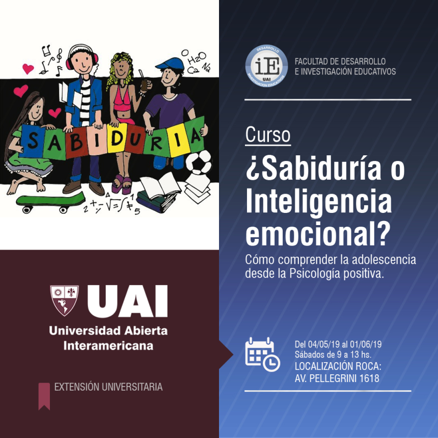 UAI ofrece 2 medias becas para el curso «¿Sabiduría o Inteligencia Emocional?» que se realiza del 4/5/19 al 1/6/19, los Sábados de 9:00 hs. a 13:00 hs. Inicia el 4 de mayo, en Rosario. LA MEDIA BECA NO INCLUYE MATRICULA. •Requisitos: ser matriculado del Colegio de Psicopedagogos 2°Circunsc. Rosario y estar con la Cuota alAmpliar